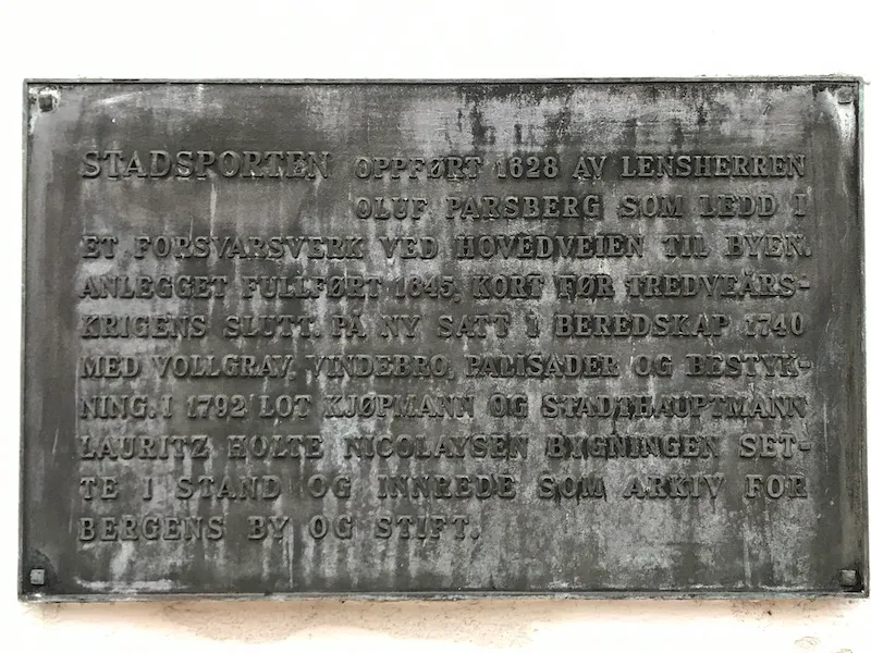 Dette skiltet er hengt opp på Stadsporten i Kalfarveien for å hedre Lauritz Holte Nicolaysen for den viktige jobben han gjorde i 1792 med å sette Stadsporten i brukbar stand igjen. Bilde er tatt av S. Søbstad, 6. mars 2020.