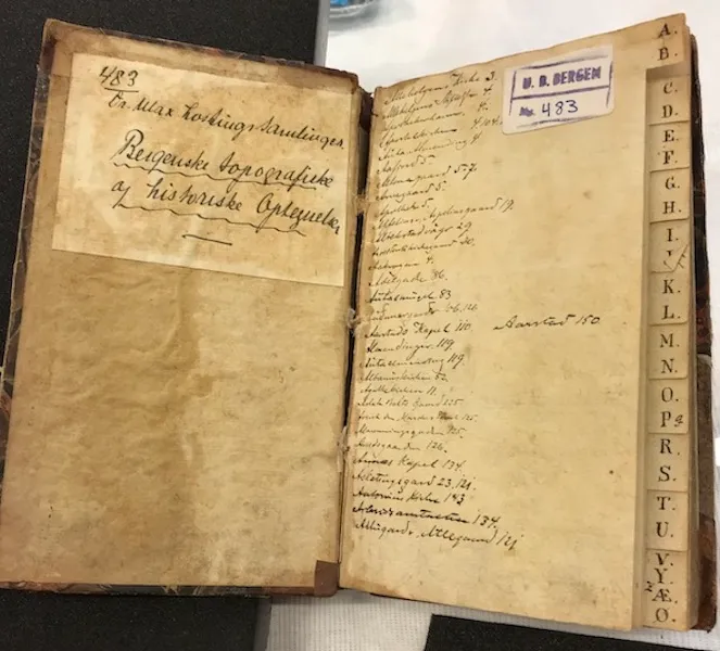 Denne søte lille boken her er ikke stort større enn en adressebok eller almanakk. Tittelen på boken er «Dr. Max Lostings samlinger: Bergenske topografiske og historiske optegnelser». Den er tilgjengelig ved UiB Manuskriptsamlingen, Ms 483 / ubb-ms-0483. Denne Max er sannsynligvis den bergenske legen Max Johan Losting, født i 1841 og død i 1911. Han var i tillegg sterkt historisk og kunstnerisk interessert.