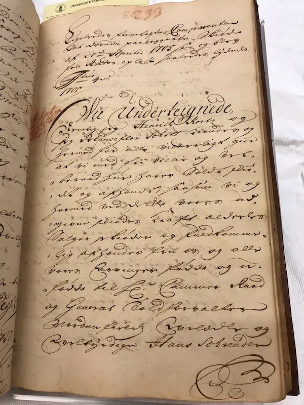 Det er et fantastisk kunstverk av en bok skrevet med vakker gotisk håndskrift. For de som har noe kjennskap til personer tilknyttet Store Kalfaret fra gammel tid, vil kanskje kjenne igjen navnene som er nevnt i teksten på bildet i midten. Her ser dere navnene: Henrich Kortz, Blanzeflor Schott og Hans Schreuder. Boken inneholder mange sider om Store Kalfaret på begynnelsen av 1700-tallet.